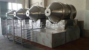 產品概述EYH型二維運動混合機是一種無菌、無塵、全封閉式的高效節能混合機,廣泛適用于制藥、化工、食品、染料、飼料、化肥、農藥等行業的粉狀、顆粒狀物料的高效混合。EYH型二維運動混合機主要由轉筒、擺動架、機架三大部分構成。轉筒裝在擺動架上,由四個滾輪支撐并由兩個擋輪對其進行軸向定位。在四個支撐滾輪中,其中兩個傳動輪由轉動動力系統拖動使轉筒產生轉動,擺動架由一組曲柄擺桿機構來驅動,曲柄擺桿機構裝在機架上,擺動架由軸承組件支撐在機架上。設備特點EYH型二維運動混合機的轉筒可同時進行二個運動,一個為轉筒的自轉,另一個為轉筒隨擺動架的擺動。在主動軸的帶動下,作周而...