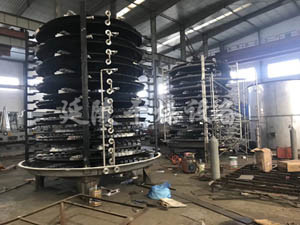 離心噴霧干燥機工作原理空氣通過加熱器轉化為熱空氣,進入裝置在干燥室頂部的熱風分配器,然后均勻的進入干燥室,并呈螺旋狀轉動,同時將料液送至裝置在干燥室頂部的離心霧化器,使料液霧化成極小的霧化液滴,料液和熱空氣并流接觸,水份迅速蒸發,在極短的時間內干燥為成品。成品經干燥塔底部和旋風分離器排出,廢氣由風機抽出排空。工程圖片
